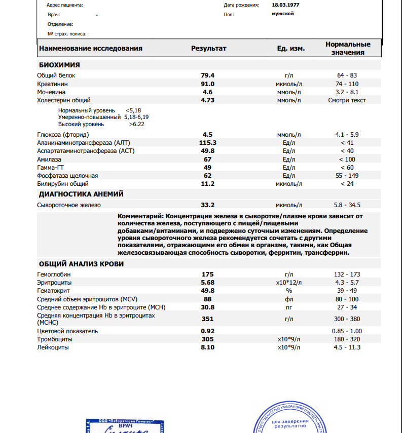 - Аланинаминотрансфераза (АЛТ) 115.3 Ед/л < 41 (Как я понял сильно завышен, в 2016 было 48.3)