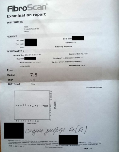 1. Фиброскан показал F2 (F1) Median 7.8 кPa IQR 0.6 IQR*/med 8 % Success rate 100 %. Из 10 измерений инвалидов не было. Проходил в Казани (Гепатоцентр в инфекционке на проспекте победы 83) стоило 1600.