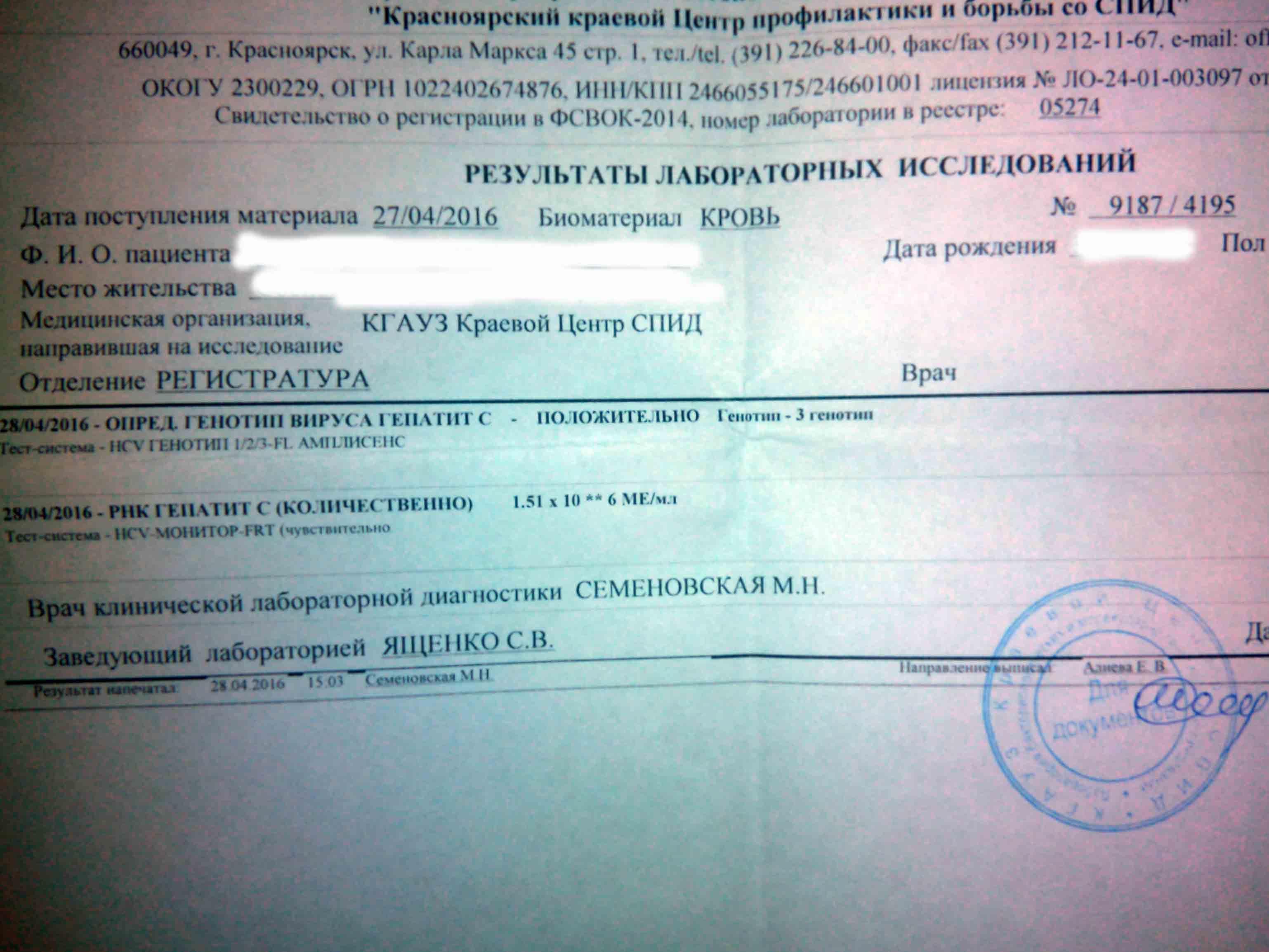 У мужа был контакт с соседом (поздоровался за руку, имея свежую рану), жена которого была больна гепС+В, цирроз. Умерла она недавно, но тогда ходила вся салатового цвета. Напугалась я и отправила сдавать ПЦР-ку. Муж ещё сказал, что мне заняться нечем, что так не передаётся, да и вообще чувствует себя хорошо. И вот, 12/04/16, пришёл результат: HBV (-), HCV (+). К слову, за последние 2 года в нашей семье сплошная «чёрная полоса»: пожар, наводнение, потеря близкого, авария… Теперь и это… Объяснять, что я пережила после его звонка с лаборатории нет смысла, всё и так понятно вам. В шоке начала искать информацию в интернете- что это, как передаётся и прочее, ведь страх был уже и за ребёнка. Сразу начала вспоминать, когда мужа проверяли на это, нашла выписку с карточки по беременности- там только меня проверяли. В документах также нашла выписку от 2011 года, когда мужу делали операцию на лёгком. И каков был мой шок, когда в клинических анализах увидела «а.т к ВГС пол». Врачи ничего тогда не сказали, а мы сами не в курсе этих сокращений и не придали значения. Теперь себя виню- столько времени упущено, а про врачей, не сказавших про это,- вообще молчу. Про дженерики не знала изначально, мысли были продать кв и машину и начать лечение. Сразу пошла в поликлинику к инфекционисту. Единственное, что удалось добиться от врача- выписали мне на антитела. А про мужа сказала- пусть даже не приходит ко мне, у меня квот нет, да и платно назначать лечение не буду, т.к. мне бесплатников хватает. Попросила написать хоть какие анализы сдать перед визитом к врачу для назначения лечения (записала его к платному). Рекомендовала фиброскан и количественный. Мой анализ на антитела в итоге потеряли, каждый день будила дочу и ехали к ним с утра в надежде получить результат, а его всё нет. Сна не было, а если и уснёшь- кошмары, руки трясутся... Короче, полный набор. Я «дошла» до 43 кг. Думала, если у меня +, значит и у дочи + будет (в порыве психов маленькая царапала до крови). Уверена была, что тоже болею. Как раз до этого мучилась с болями, прошла всех врачей, попав в итоге на скорую, при УЗИ брюшной полости спросили: «А вы не болеете ли гепатитом?» Нашла я свой анализ позже аж в гинекологии (отрицательно). На след. день поехала в город и сдала ПЦР (отр). Дочу проверять не стала.