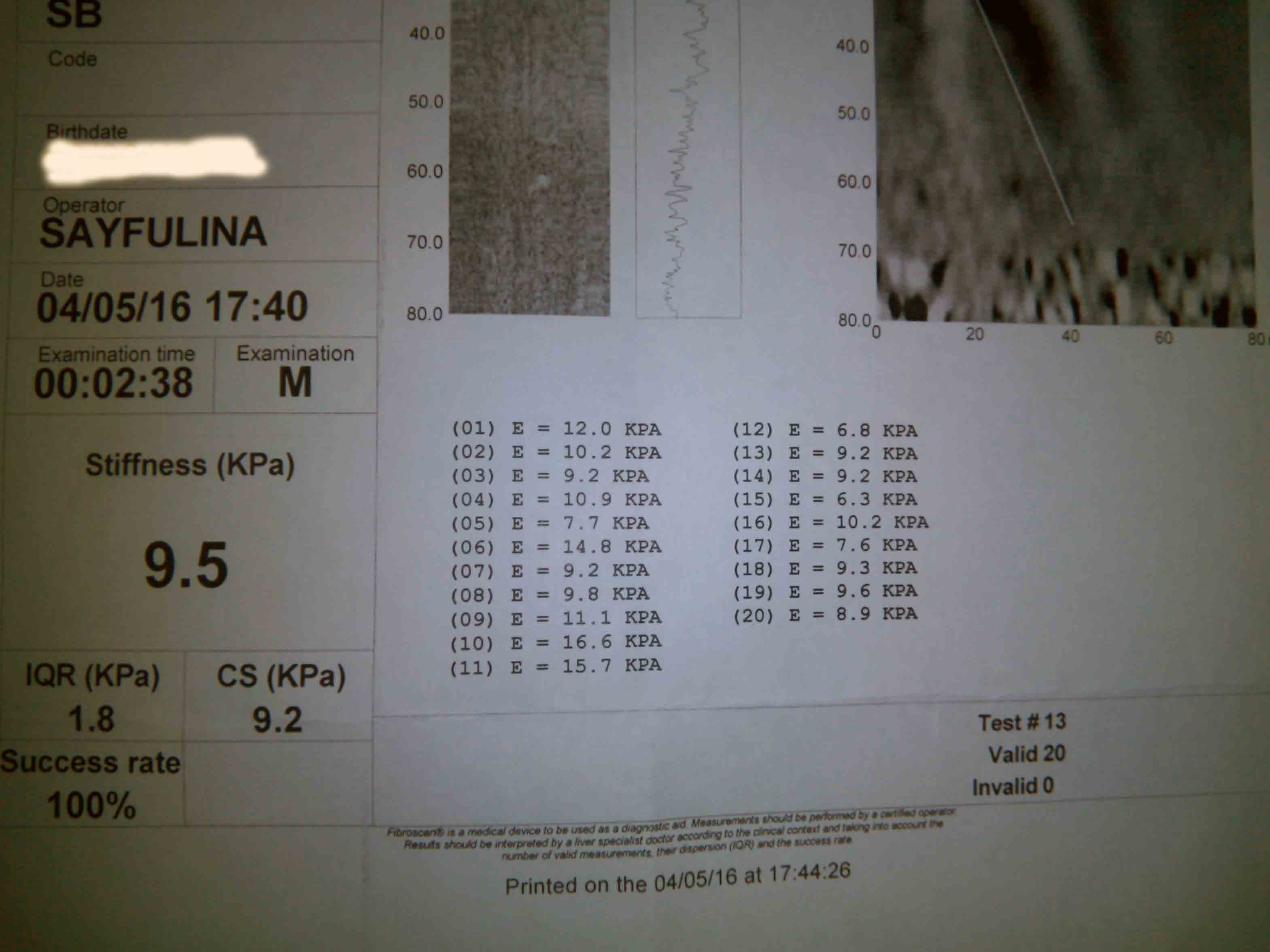 04/05/2016 муж прошёл фиброскан: эластичность печени 9,2 кПа, стадия фиброза F2 по METAVIR с вероятностью 93,2%. Девушка, что проводила обследование, недовольно высказалась: «Что вы всё ходите без направления врача? Ко мне надо с анализом крови приходить, а то ваше обследование потом можно просто выкинуть, если показатели крови будут такие-то…». Ф2, а возможно и 3, сказала она.