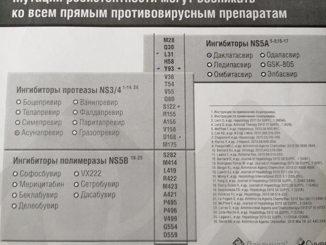 Двойная NS5A-мутация на дак L31M+Y93H является сильной даже для схемы соф+дак, а для схемы дак+асун так просто фатальной! (Вирусологических неудач на дак+асуне при такой комбинации мутантов - под 100%.) NS3-мутация на асун S122N в данном случае уже ни на что не влияла, хотя в австралийской инструкции к Сунвепре указано, что на схеме дак+асун наличие S122N даже при отсутствии мутаций на дак снижает эффективность дак+асуна на 10%.
