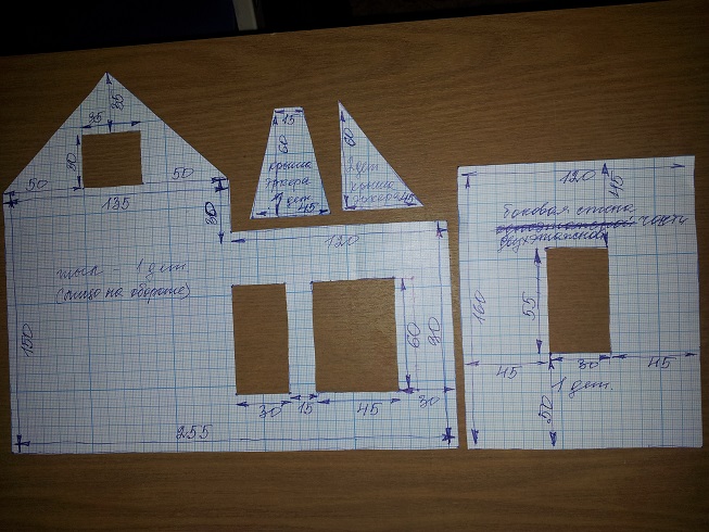 Итак, наш пряничный домик. Для начала выкладываю лекала для него. Это довольно большой домик, его можно уменьшить в масштабе. Еще нужно будет испечь полянку-основание, на котором будет размещаться домик и фигурки разные вокруг него. Размер полянки произвольный. Я беру для домика указанные размеры и полянку размером почти с противень. Надеюсь, что мои надписи на лекалах понятны и разборчивы. Если что не понятно, спрашивайте.