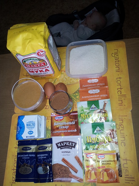 У меня на фото слева на право и сверху вниз - мука, сахар, мёд, яйца, какао, лимонная и апельсиновая цедра, масло, ванильный сахар, мускатный орех, душистый перец и гвоздика (их перетерла в ступке, т.к. в пакетиках не порошок, а целиком), корица, имбирь и разрыхлитель.