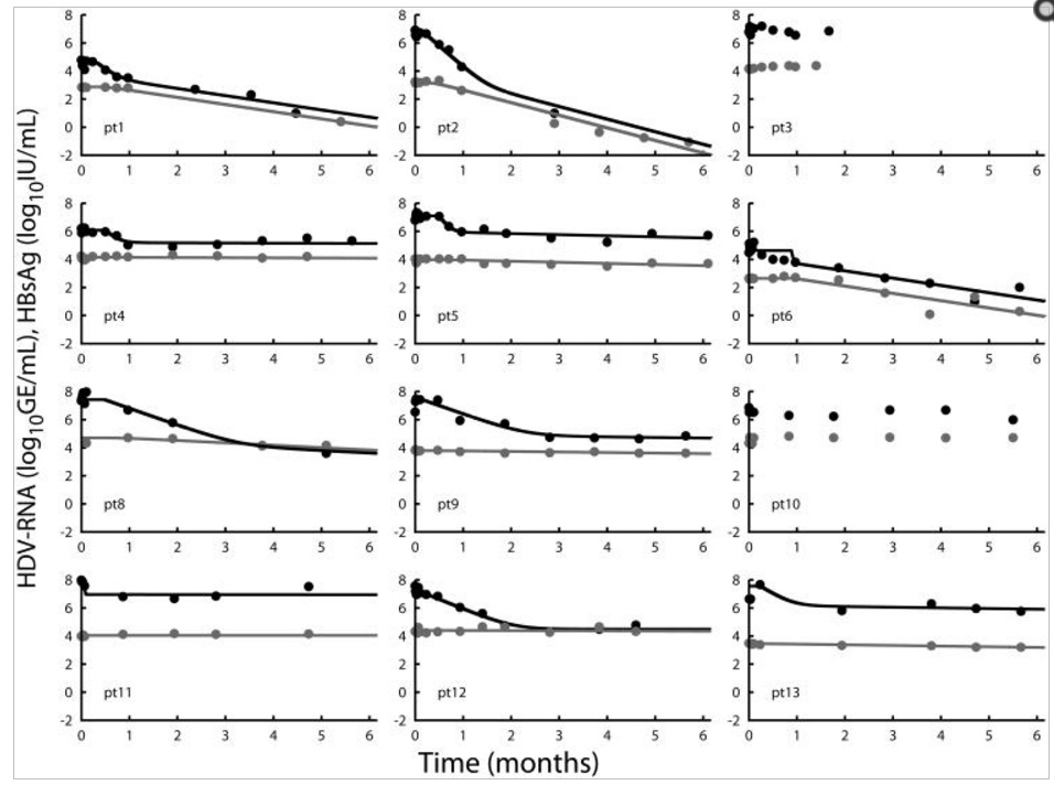У десяти пациентов, у которых можно было охарактеризовать кинетику HDV наблюдалась задержка в несколько дней до того, как нагрузка РНК HDV значительно снизилась по сравнению с исходными уровнями. РНК HDV уменьшалась двухфазным образом с начальным быстрым вирусным снижением, за которым следует более медленная вторая фаза вирусного снижения