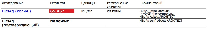 HBsAg: 02.2017 – 2129 ME/мл; 06.2017 – 65,45 ME/мл;