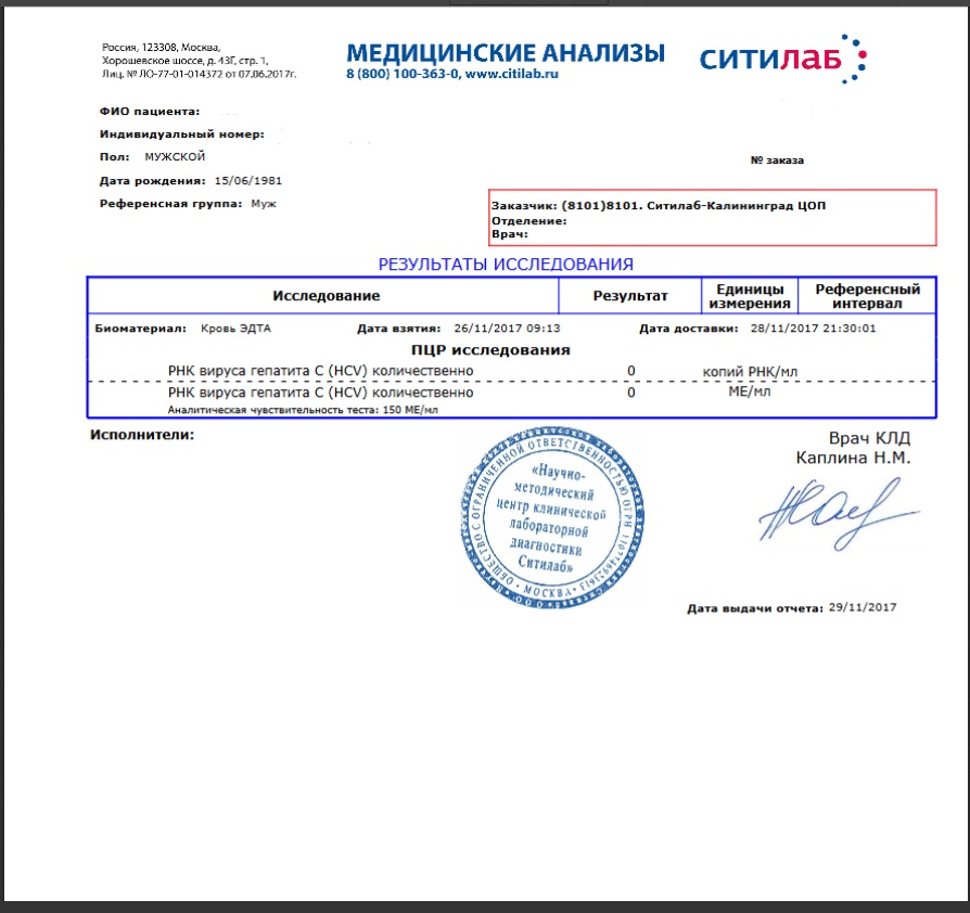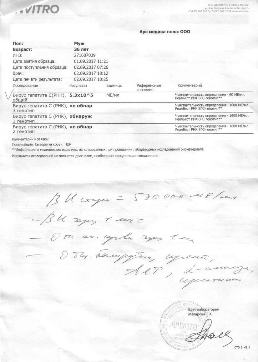 После обнаружения антител был поставлен на учет в местную инфекционную больнице. Где врач сильно престарелого возраста не задумываясь назначила интерферон. К счасть пошел по наводки к другому врачу (гастроинтеролог он на тот момент один из не многих наблюдал гепатитников.) Он отменил интерферон. С тех пор находился под наблюдение у него. В 2009 году впервые сдал анализ ПЦР (В Санкт-Петербурге) который выявил наличие и генотип 1. Повторный анализ в 2013 и этим летом подтвердил.