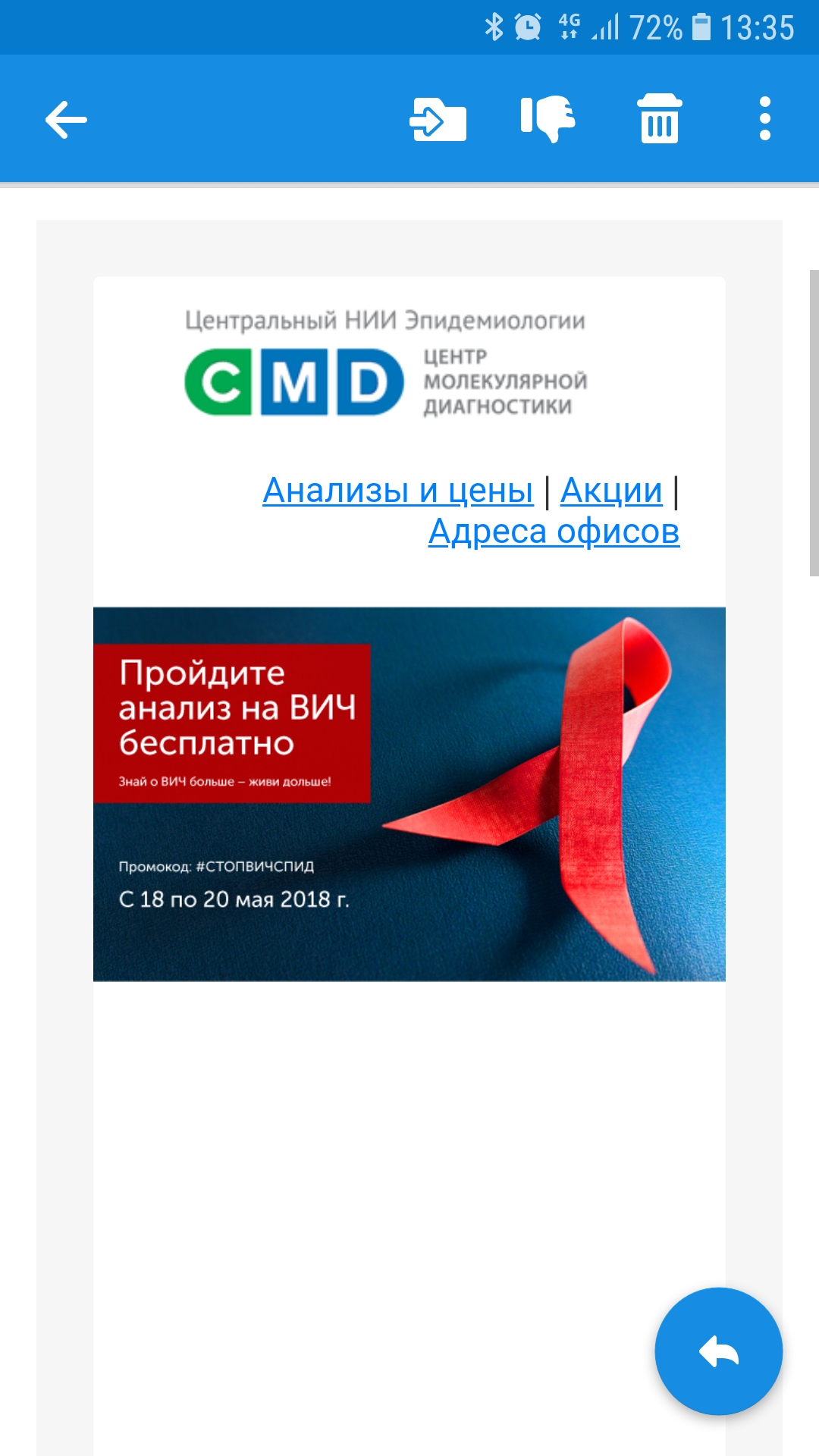 Бесплатно анализ на вич в СМД по промокоду с 18 по 20 мая.