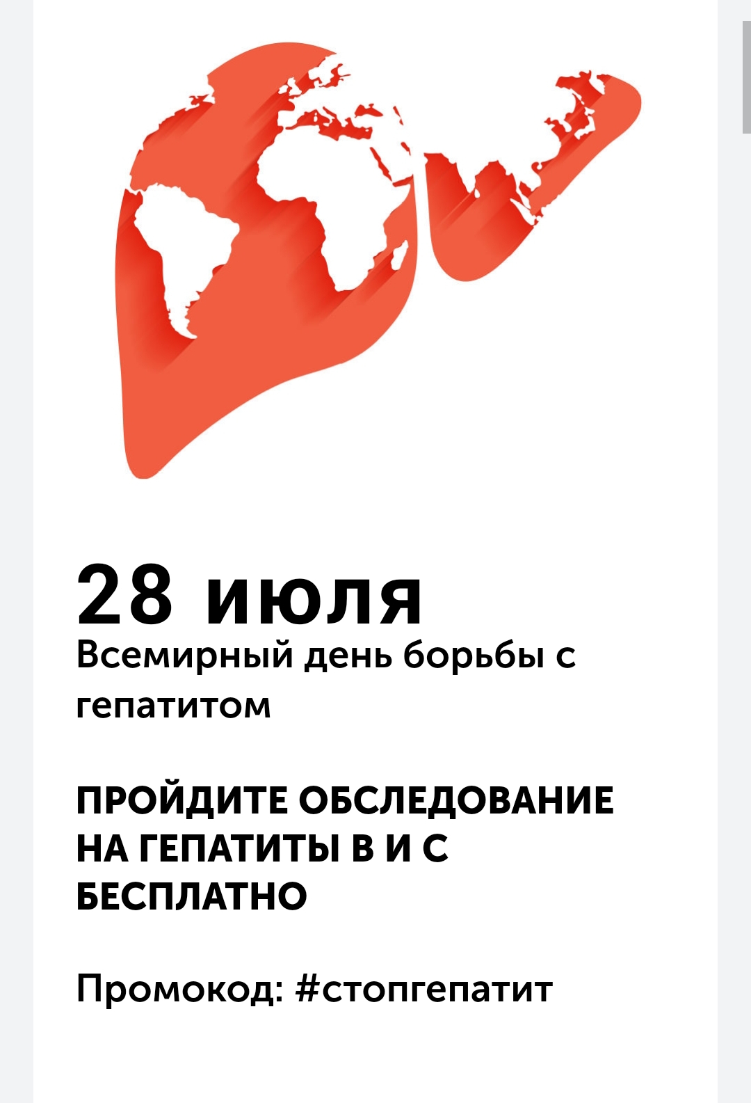 В рамках Всемирного дня борьбы с гепатитом мы предлагаем Вам сдать скирининговый анализ и быть уверенными в своем здоровье.