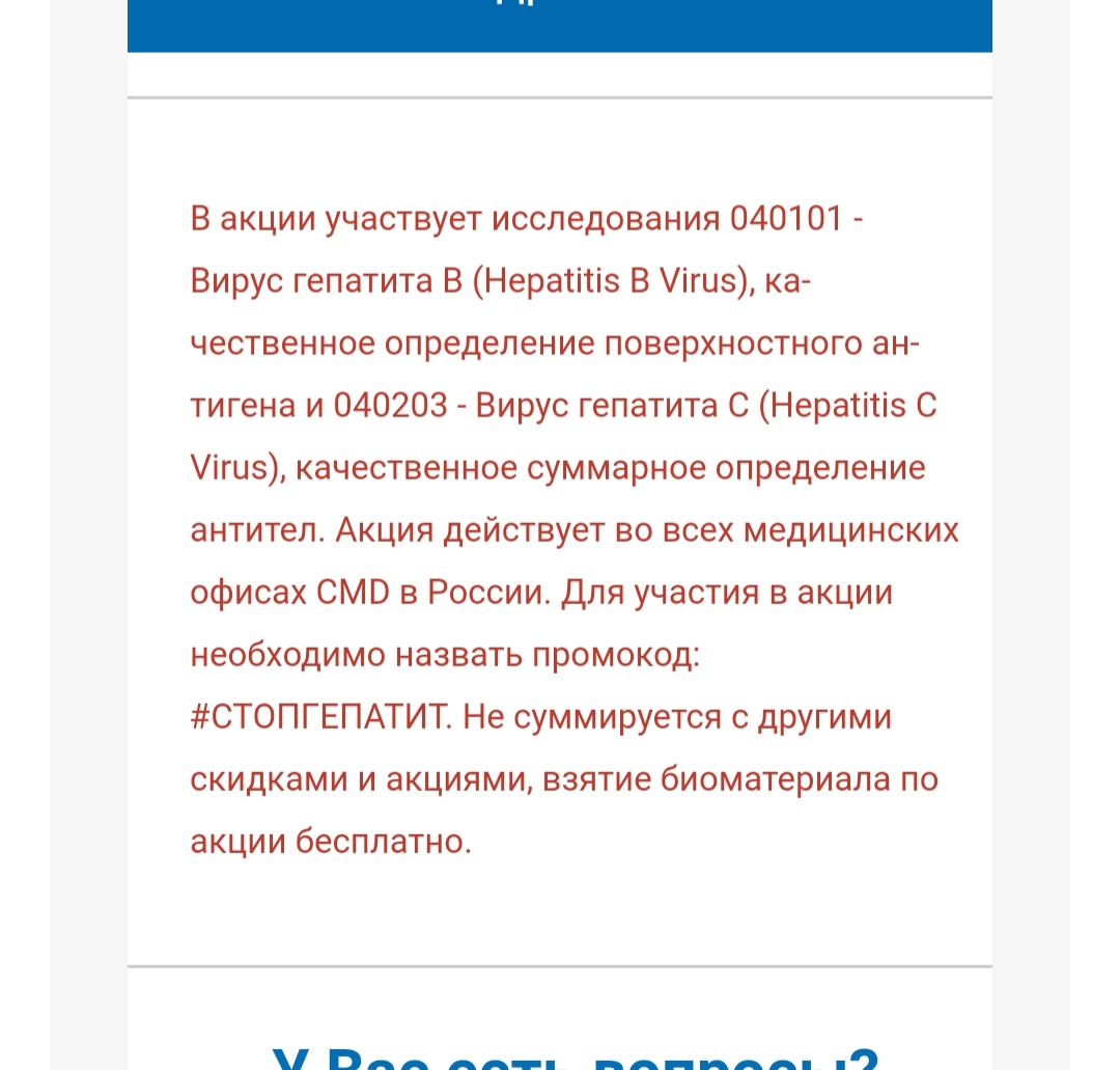 28 июля любой человек может пройти бесплатное исследование на определение поверхностного антигена вируса гепатита B HBsAg (австралийского антигена) (Hepatitis B Virus) и определение антител к вирусу гепатита С (суммарное) (Hepatitis C Virus). Акция действует во всех медицинских офисах CMD по промокоду #СТОПГЕПАТИТ.