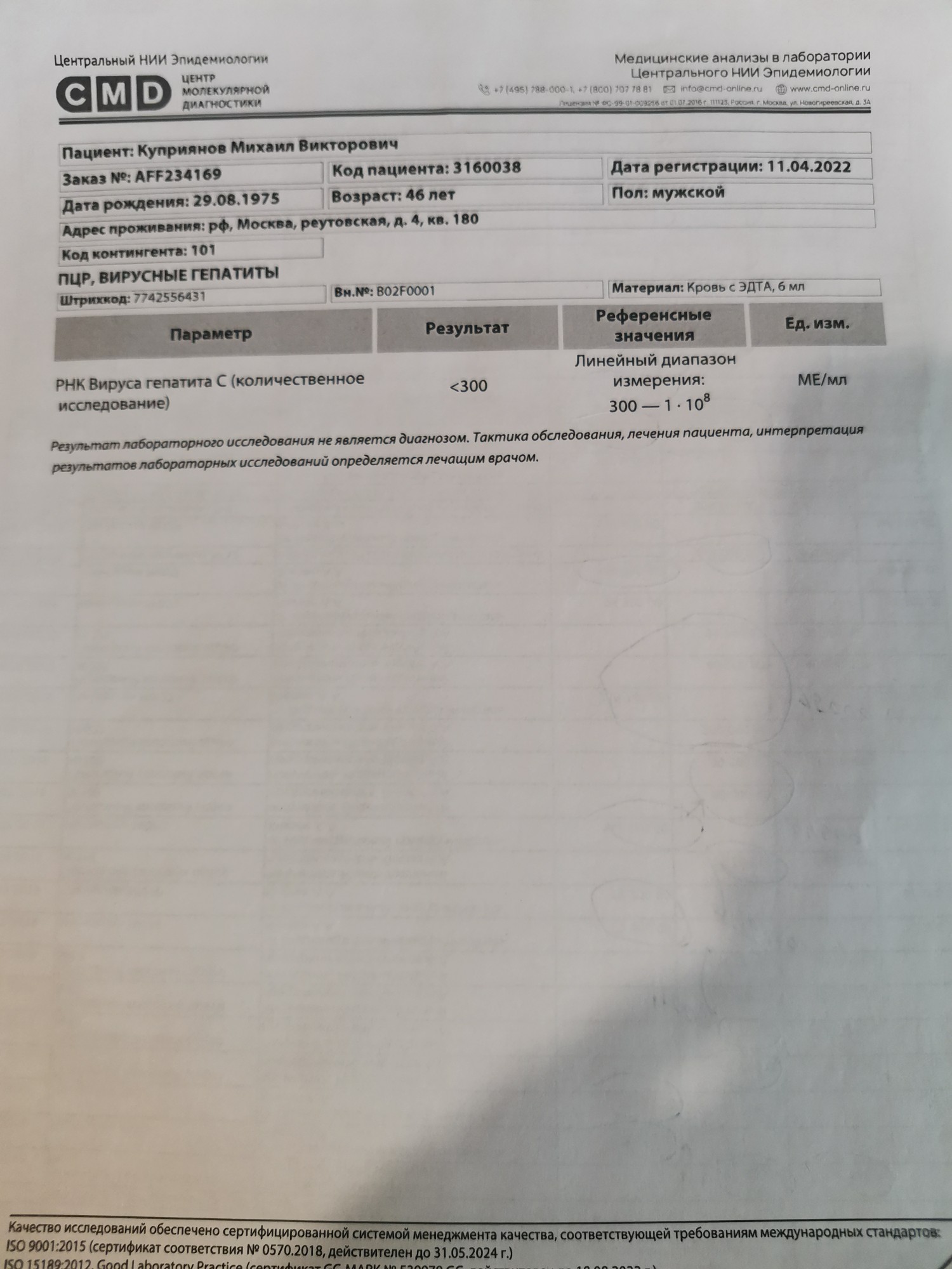 Генотип 1а+1b, 1.7×10⁶ Ме/мл, F0, АСТ-39, АЛТ-36, Бил-8,3
