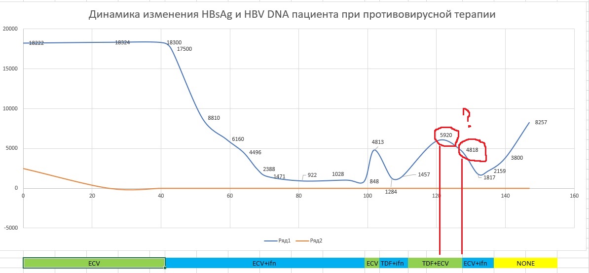 В любом случае какой то эффект точно есть, почему hbsag без ничего на исходные 18000 не вернулось? Почему колеблется в коридоре от 7000 -9000, почему через 6 мес без ничего днк на нуле, итд. Больше вопросов чем ответов.