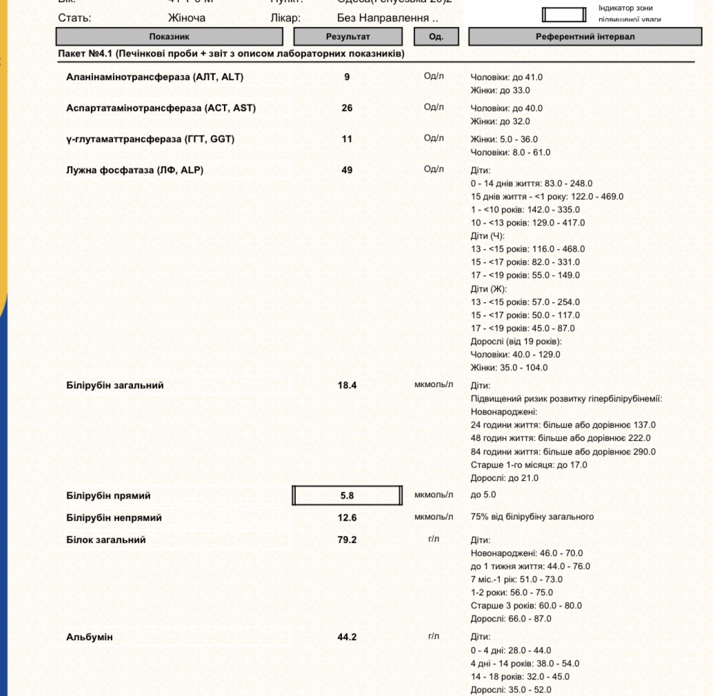 Алт 26 Аст41 при норме до 38 и билирубин 22,6. Незнаю что дальше , наверное УЗИ надо, ФГДС делала полгода прошло.