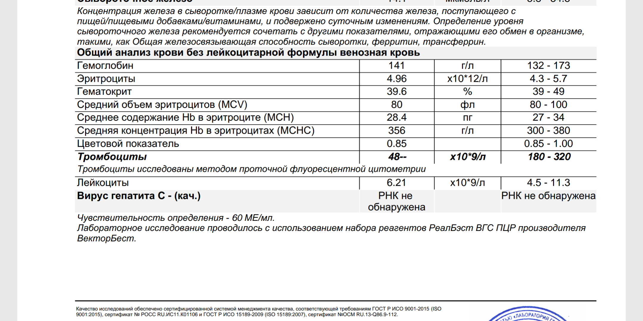 2нед. ПЦР"-" 60МЕ/мл гемотест