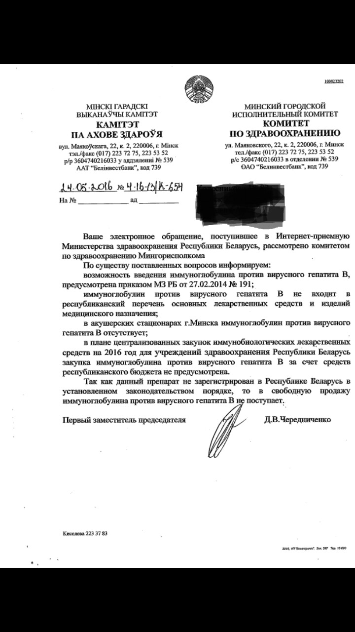 Согласно Вашему ответу от 24.05.2016г. № 4-16-13/К-654 возможность введения иммуноглобулина против вирусного гепатита В, предусмотрена приказом МЗ РБ от 27.02.2014г. №191.