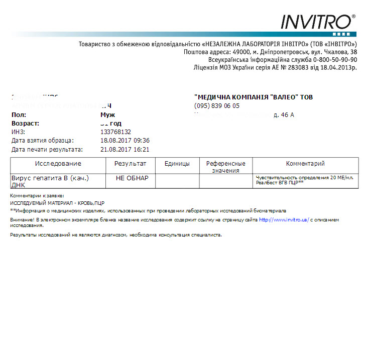 19.11.2016 Старт ПВТ Тенофовир; 5.01.2017 АЛТ 260; 15.02.2017 ПЦР 16000МЕ/мл, 15.05.2017 - 560МЕ/мл, АЛТ 31; 18.10.17 - не обнаружен, 5.01.18 - АЛТ 16; 1.06.2018 qHBsAg 1238ME, 12.04.2021 qHBsAg 750ME