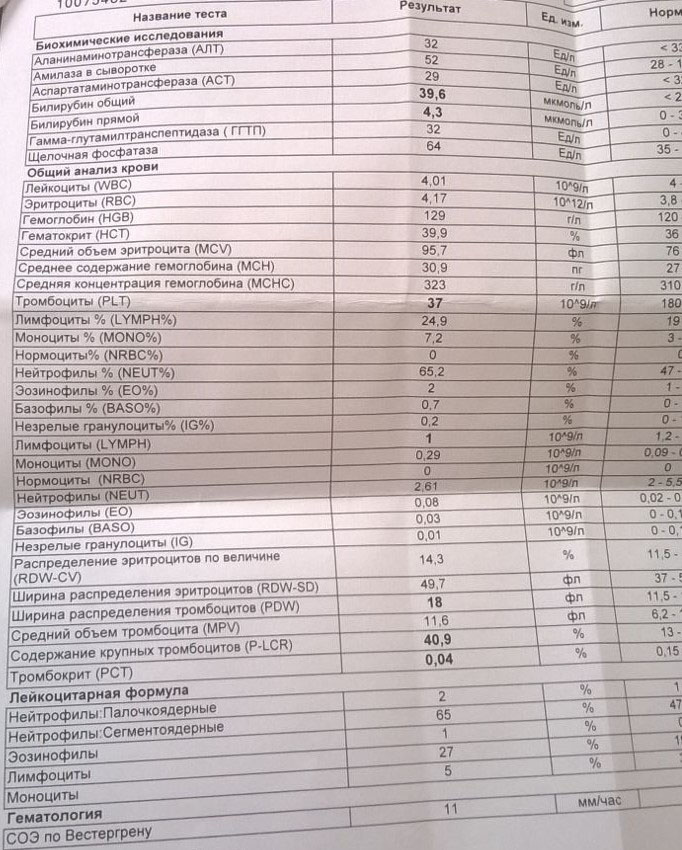 "очень низкие тромбоциты (40) надо думать насчет тромбопаг, револейд