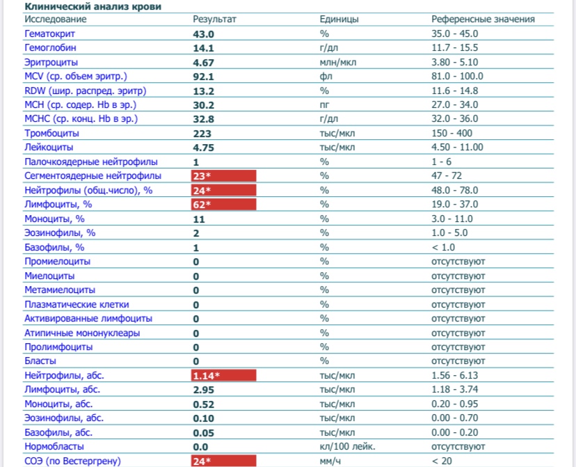 Лейкоформула сдвинута чисто за счёт нейтрофилов. При этом СОЕ завышен. Где-то есть воспалительный процесс, вероятно бактериальный.