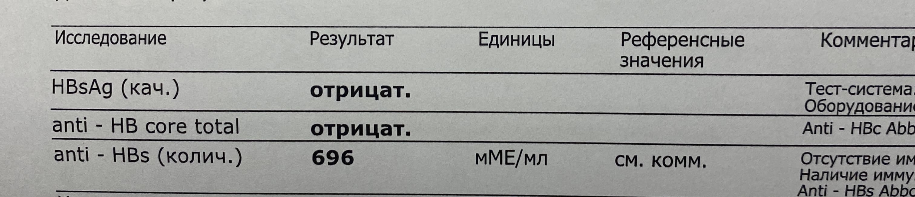 anti-HBcore отрицательно, anti-HBs положительно