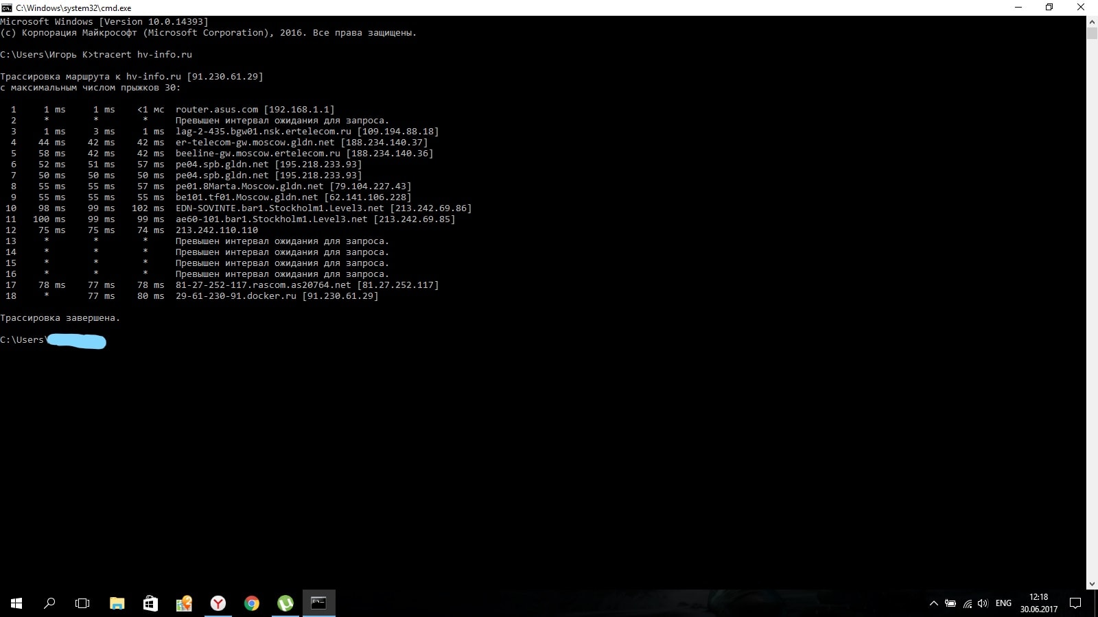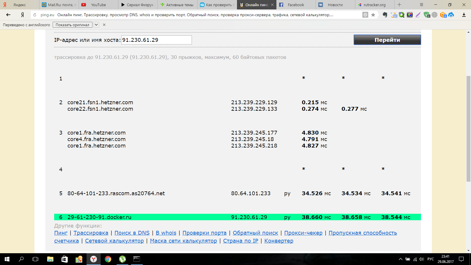 Gudvin » 29 июн 2017 16:44 писал(а):Проверьте тогда пожалуйста трассировку (инструкция по указанной ссылке) и выложите результат. IP сайта 91.230.61.29
