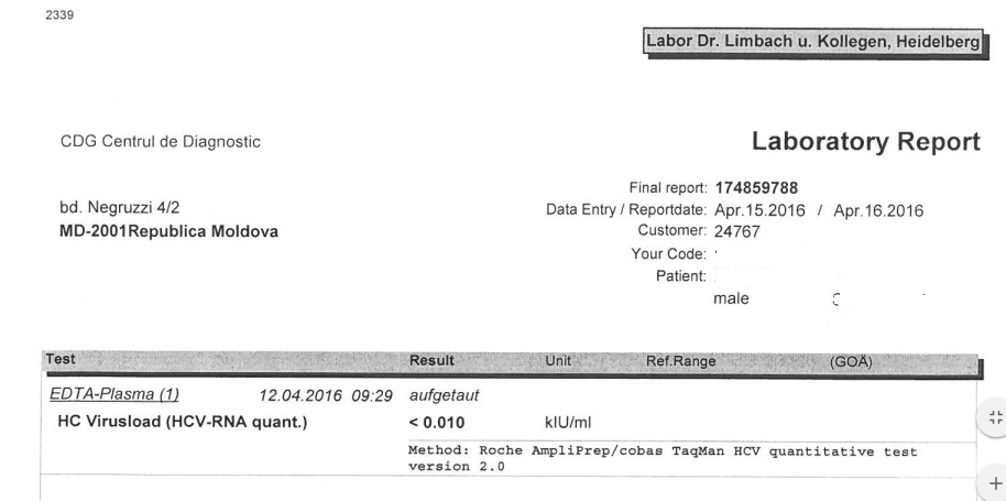 Для нас это очень дорого, 2760 лей. Но тут у меня выбора не было. Это требование миграционной службы той страны, куда хочу въехать. Они принимают результаты наличия болезней только от ГермДиагнЦентра. Более того, из-за того, что ранее у меня обнаружили ГепС и это был повторный анализ, то, даже когда у меня кровь брали этот раз, для устранения подлога, сидел рядом представитель консульской службы и смотрела как мне вводят иглу и берут кровь.