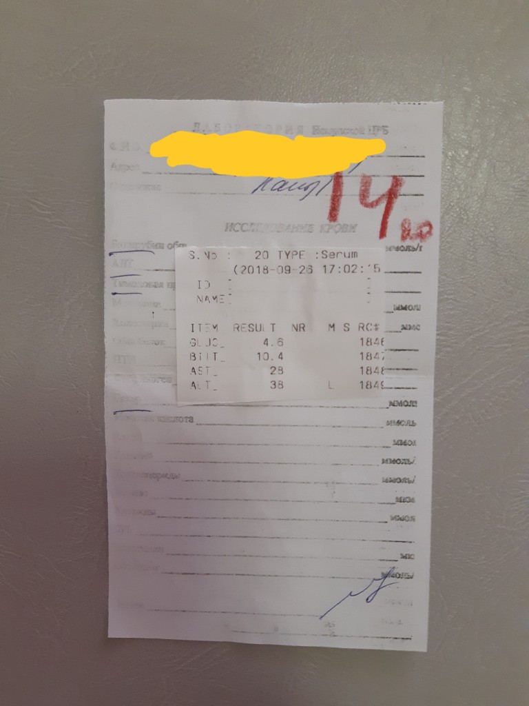 ALT 28, AST 30, билирубин 7, общий белок 63, сахар 5. Узи печени, увеличена на 2 миллиметра. Вируса нет