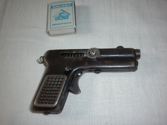 Металлический игрушечный пистолет, сделанный в СССР. Стреляет карандашами, палочками, и вообще всем твердым что подходит по калибру и не застревает в стволе. Заряжается 1-м "патроном" через дуло методом засовывания. Потом руками взводится пружина и пистолет готов к стрельбе. Т.е. пистолет однозарядный. Пружина тугая, взводить за кончики металлического болта непросто, особенно детскими руками. Развивает силу пальцев, слабыми руками пистолет не зарядить. Пистолет тяжелый, железный, трудно ломаемый.