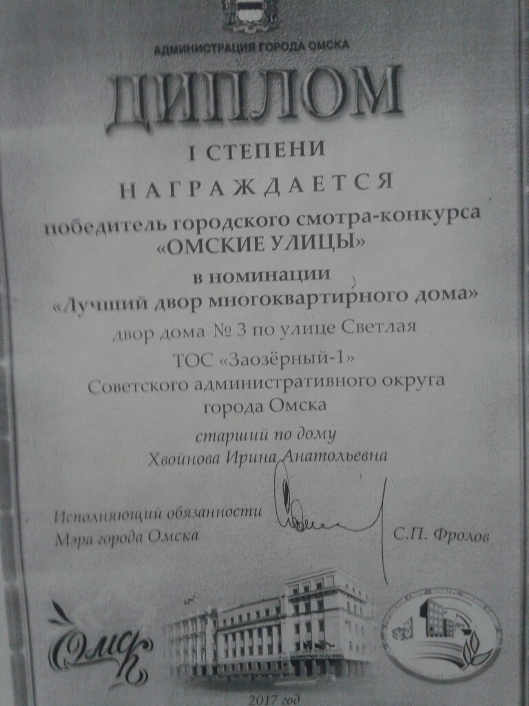 Диплом чуть прояснил ситуацию. Если [url=http://www.omsk.aif.ru/society/konkurs_moy_dvor_-_moya_ulica_otkryt]13 августа[/url] рыбкин двор не займет минимум второе место (согласно [url=http://www.modus-omsk.ru/images/newnews/Pravila_dlya_abonentov2.pdf]пункта 5 Условий участия в конкурсе[/url] голосование проводится за второе и третье места, а первое определяет таинственное Жюри) и, таким образом не станет обладателем денежного сертификата в размере 30000 (второе место) или 50000 (первое место) рублей на установку любой системы безопасности от компании Модус, то ТОС "Заозерный-1" может попробовать высказать своё вежливое мнение по итогам конкурса на полях http://www.omsk.aif.ru/ .