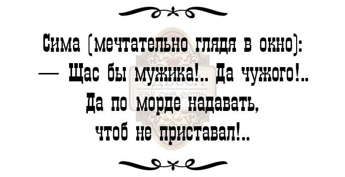 Кошмар! Женская логика)))))))))) Знаю я один простенький салатик с ветчиной. А тут, как раз, ветчина осталась — никто не ест. Дай, думаю, сделаю для разнообразия. В салатик идут ананасы. Открыла банку, вынула фрукт — остался сок. Пить не хочется, выливать жалко. Знаю я один кексик, в него сок по рецепту кладут — ананасовый или апельсиновый. Закрутила кексик, в него почему-то из яиц только желтки. Белки остались. Выбросить жалко, хранить — всё равно в конце концов выброшу. Подумала — можно безе сделать. Ничего сложного. В безе лимонную кожуру натерла. Остался лысый лимон. Если его тут же не употребить, засохнет! Ну, лимон это просто. Соус отличный получается для салата. В салат нарезала пол- луковицы. Только большие луковицы в доме! Осталась половина — ну что с ней делать? Решила томатную подливу для спагетти пожарить, больше жарить с луком было нечего. Открыла банку томатной пасты, употребила половину. А вторую половину куда? Забуду ведь в холодильнике, а она без консервантов пропадёт. Решила сварить борщ. Для борща не нашлось капусты. Пришлось идти в магазин. В магазине купила капусту, морковку, селёдку, колбасу, салфетки, стиральный порошок, скатерть (по скидке), тапочки (тоже по скидке) и прокладок три пачки на всякий случай. По дороге из магазина заехала в банк - кредит оплатила, потом рядом в фотоателье забрала фотографии, забрала туфли из ремонта, купила в булочной булочки детям на завтрак. Еле дотащила всё это на четвертый этаж. Сварила борщ, уже не заметила, осталось ли что-то. Упала на диван, спина не разгибается, ног не чувствую, руки отваливаются… Думаю, вот ДУРА! Надо было вылить на х..й этот ананасовый сок!!!