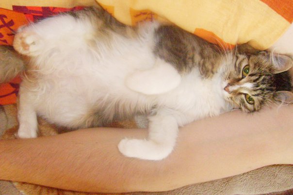 Кошку зовут Сью (Сьюшенька, Сьюшка). Эту малявку я подобрала. Ей где-то 3 года сейчас. Подобрала в октябре 2009-го. Она жила в подъезде, периодически ее пинками выгоняли на улицу, а были уже заморзи ночью, днями шел дождь. Папа мой курит в коридоре, и она каждый раз забиралась ему на колени. И вот я просто однажды не выдержала и притащила домой этот маленький грязный комочек. Мы ее отмыли, блох полечили (они были с ноготь на мизинце