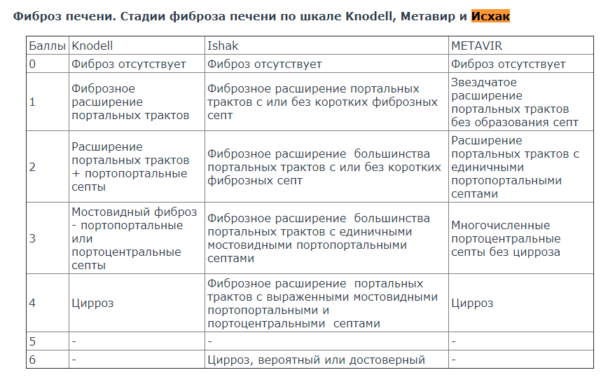 Кнодель (KNODELL), Исхак (ISHAK) используются при биопсиях печени!smilla » 04 янв 2018 23:37 писал(а):В классификации фиброза, могут быть использованы шкалы Кнодель (KNODELL), Метавир (METAVIR), Исхак (ISHAK), изначально предназначенные для определения стадии поражения печени при вирусных гепатитах. Для подсчета индекса введена бальная оценка.