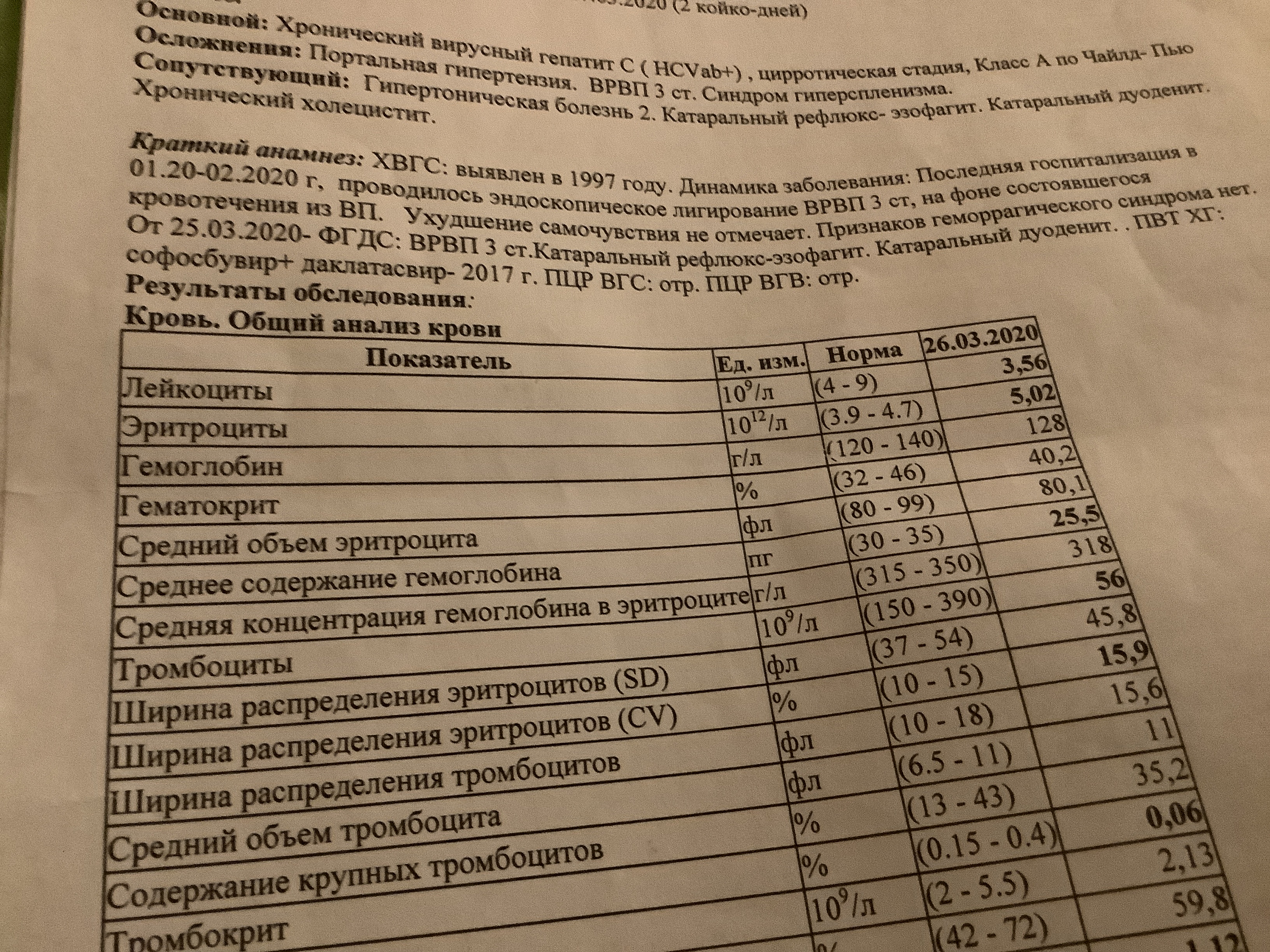 Цирроз, геп С. F4. Варик. расш. вены пищевода 2 ст. Синдром гиперспленизма. Печен. энцефалопатия I-II ст. Втор. панцитопения тяжел. ст. Анемия, ср. степ. Вес 65