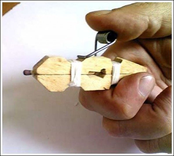 наверное пальцами шпульку держат ,и нажимают на большой круг.проволока отстреливает и снаряд улетает.