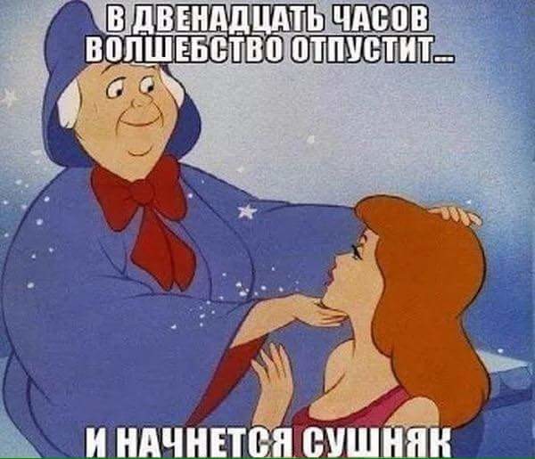 Поехала Золушка в ночной клуб. Колбасится с принцем на танцполе, хорошо ей до невозможности, но вдруг чувствует - измена, двенадцать! Кинулась она к выходу со всех ног, выбегает на улицу, смотрит на свой мотоцикл, а мотоцикл превращается в тыкву! Смотрит на себя - а сама превращается в тумбочку! Смотрит на ночной клуб - а ночной клуб превращается в отделение милиции! Тут выбежал из клуба принц - что с тобой, Золушка? А та слова вымолвить не может, только мычит и на пальцах показывает - двенадцать! Не дурак был принц, все понял, посадил Золушку в свои "Жигули" и увез минералкой отпаивать, через два дня отпустило. Потому что двенадцать таблеток "экстази" - это такой нереальный передоз, что реально и с реальностью попрощаться!