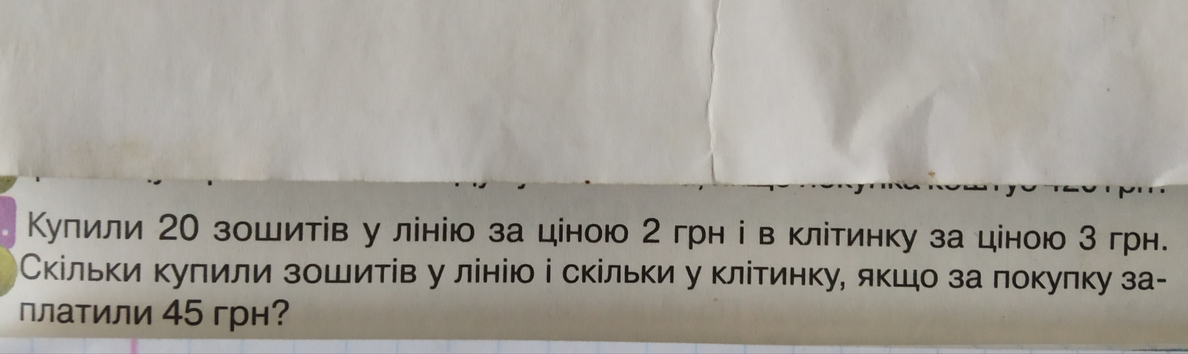 Master Shifu писал(а): 02 дек 2018 15:43 Купили 20 тетрадей, в линию по цене 2 грн и в клеточку по цене 3 грн на общую сумму 45 грн. Сколько каких?
