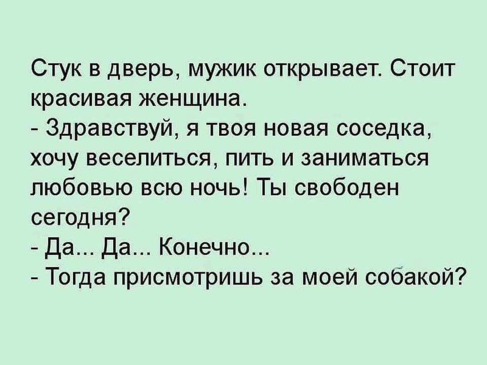 Жена: Ты можешь и пропустить, а я, наверное, выпью.Почему напилась, почему напилась? А потому, что после шести жрать нельзя.