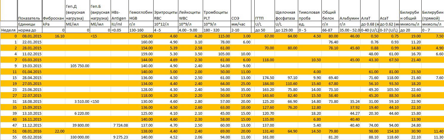 Прошел год ПВТ. Из лекарств принимаю только Пегасис-180. По началу количество вируса геп.Д уменьшалось, но в какой-то момент, похоже, вирус мутировал и нагрузка стала увеличиваться. Сейчас у меня большие сомнения по поводу продления этого лечения т.к. за год увеличился фиброз, селезенка увеличилась на 50%, отключился ЖП, появился гипотиреоз, повысилась утомляемость, по вечерам температура 37,3. Прилагаю результаты анализов в сводной таблице.
