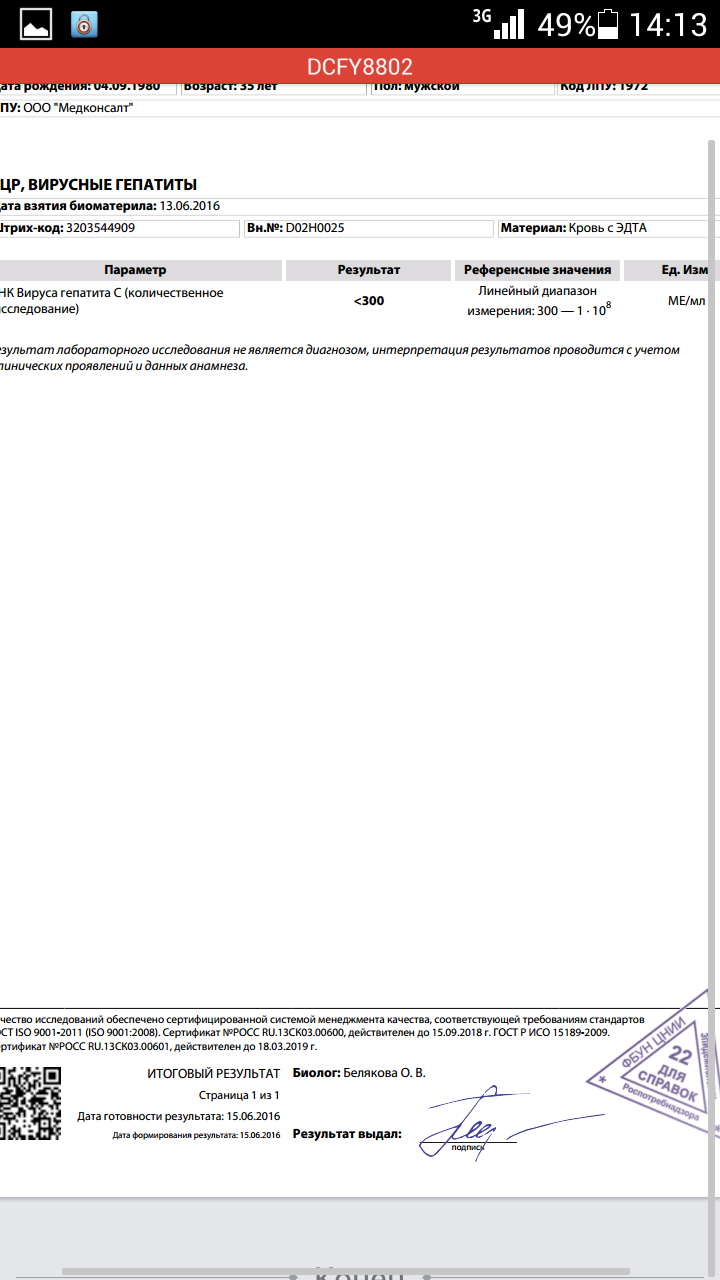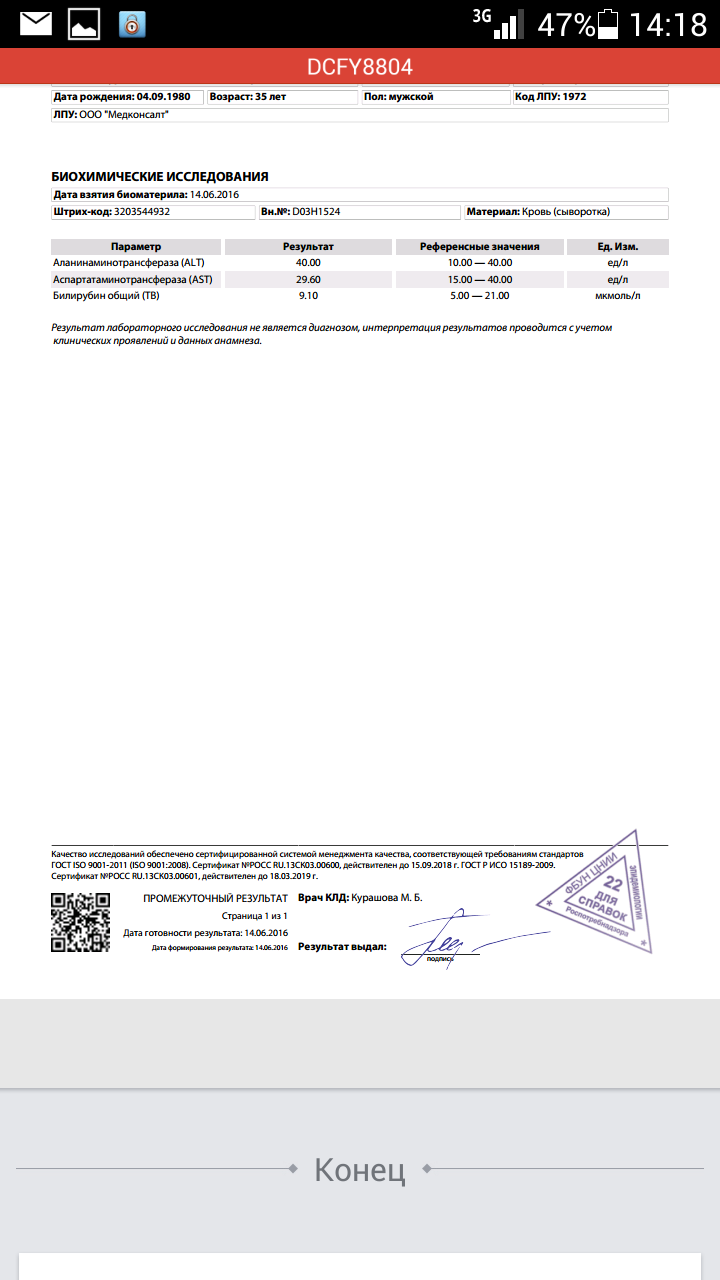 Прошло 14 дней с начала приёма лекарств. Сдал анализы в выходные:ПЦР, биохимию и общий. Сегодня получил результат :