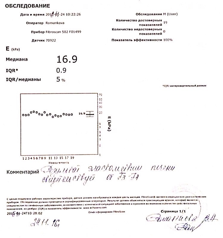 Фиброскан 08.2015 (11.0 КПа ) 01.2016 (10.4 КПа, 07.2016 -7,9кПа
