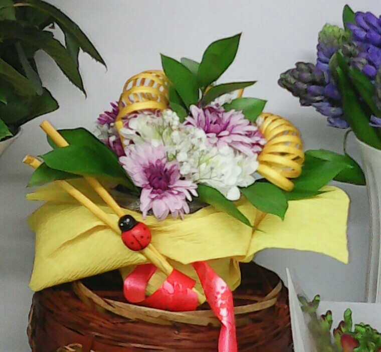 (это тематическая композиция...собирается в большой корзине, куда ставятся горшечные растения с красивыми листьями и цветами...между ними ставятся колбочки со свежесрезанными красивыми цветами и добавляются различные аксессуары в зависимости от темы...детская тема( мягкие игрушки, конфеты...8 марта или Н.Г.( шампанское, новогодние игрушки, чай)