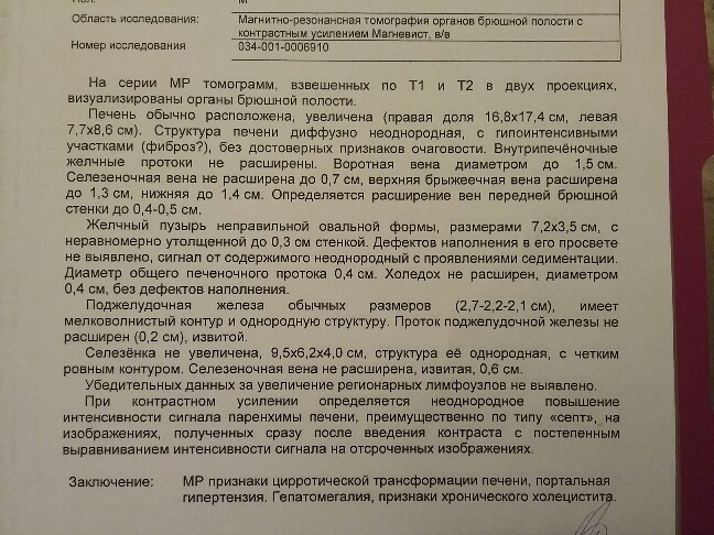 hellll писал(а):Также прошел МРТ 30.10.16 Заключение: Признаки цирротической трансформации печени,портальная гипертензия. Гепатомегалия,признаки хронического холецистита.