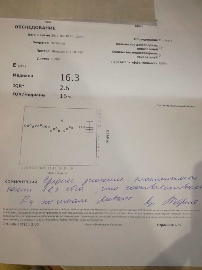 Я посмотрела... Эластография печени выполнена на фиброскане: сделано 19 замеров... об этом я написала выше.