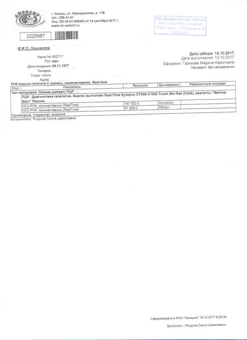 Вирусная нагрузка на начало лечения - 67000 МE/мл