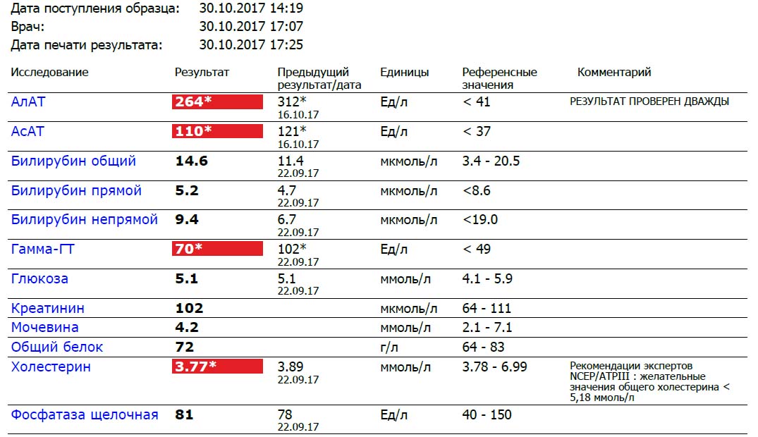 С 20 октября ставил Гептрал внутривенно и пил Урсосан. 30 октября сдал анализы и как видно толку ноль (последний раз сдавал алт и аст 17 октября), либо должно пройти какое-то время - показатели не снизились, понизилась только ГГТ.