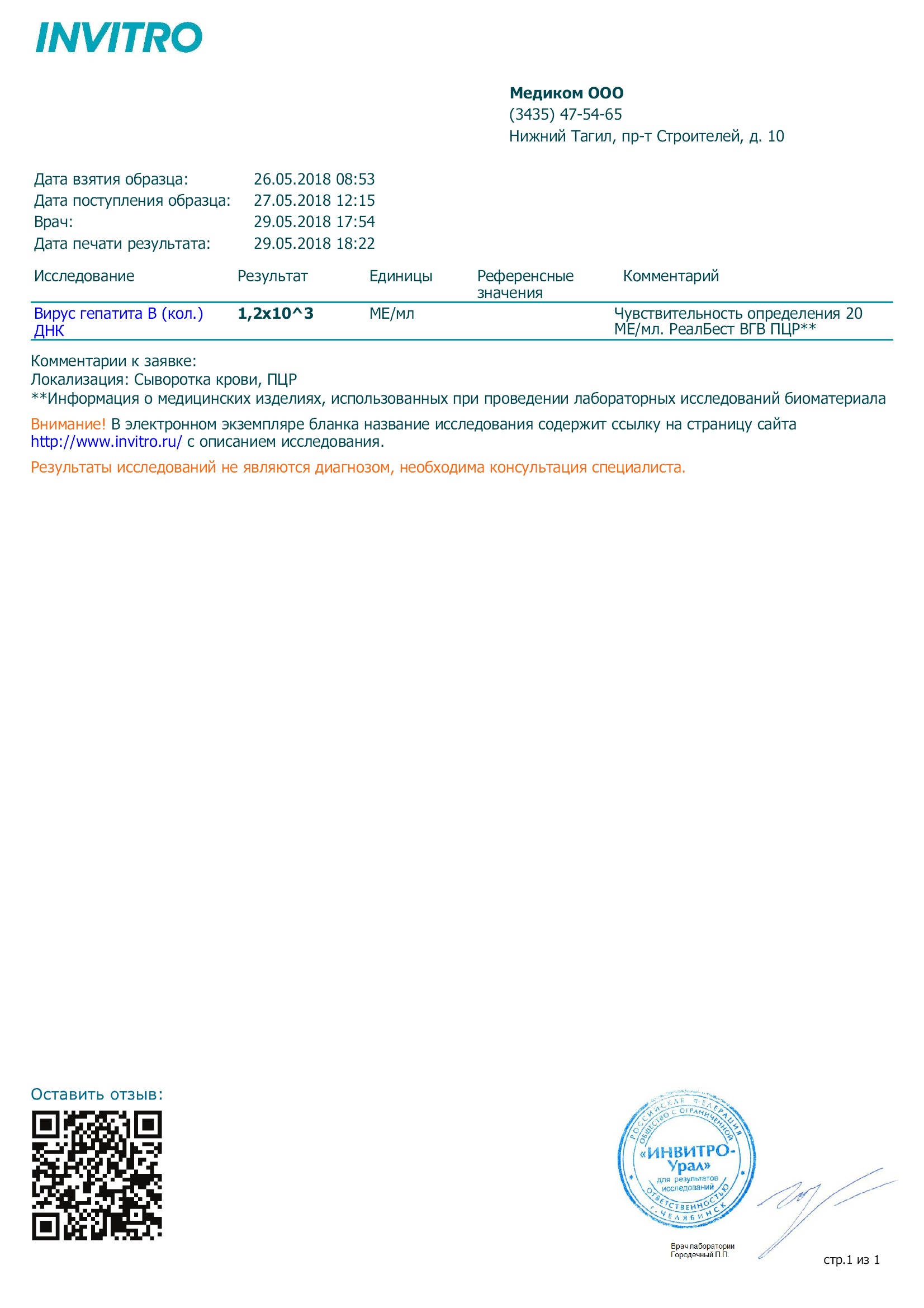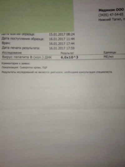 HBV (ДНК): январь 2013: n х 10*4; 2014: n х 10*4; январь 2017: 6,0 х 10*3; май 2018: 1,2 х 10*3; октябрь 2018: 9,7 х 10*2