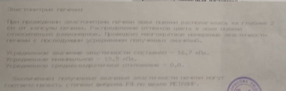 Одному фиброскану не стоит слишком доверять, нужна общая картина для оценки - УЗИ брюшной полости, функция печени - альбумин, билирубин, протромбин, МНО. Был ли асцит, энцефалопатия. Общий анализ крови с тромбоцитами. Можете выложить эти данные? Может, там вообще здоровая печень.Анна Нилреб писал(а): ↑10 дек 2018 01:25 1. Фиброскан нам показывает цирроз, но судя по опыту форумчан при высоких показателях АСТ и АЛТ результат может не верен, показывать в большую сторону. Какой анализ есть точней, чем фиброскан для определения поражения степени?