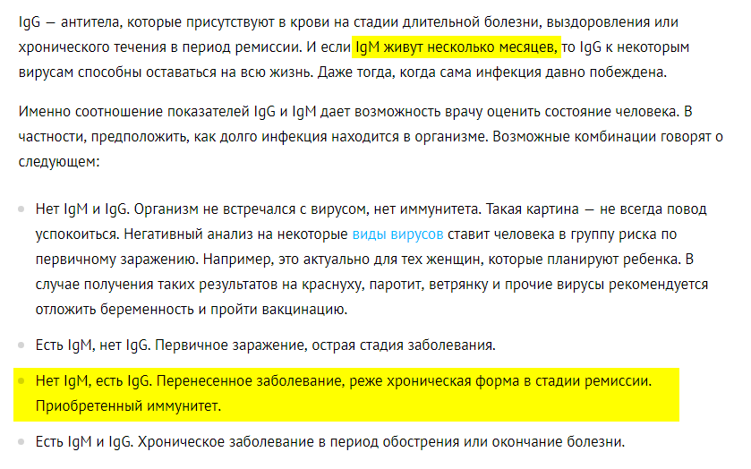 А по той статье выше (и по некоторым другим), где я выделил желтым этот результат: IgM-, IgG+, написано что болезнь перенесена и выработан иммунитет.
