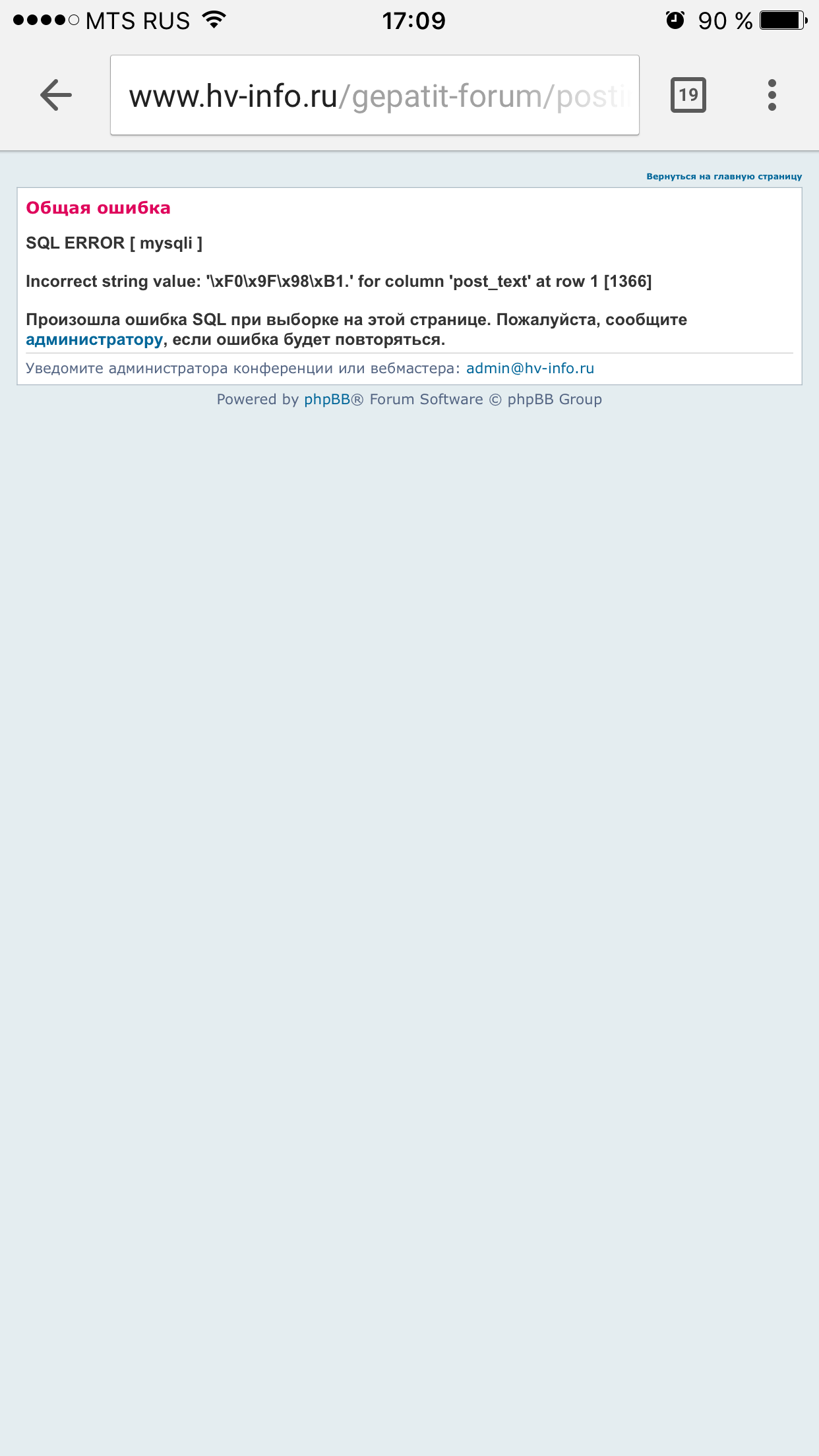 Эта ошибка возникает при попытке ввести некорректные символы (с точки зрения интерпретатора БД) - обычно коды сторонних смайлов и т.д. Проблема известна давно и не является критичной. Для ее решения нужно будет отключать форум на несколько часов, поэтому пока ничего не предпринимаю.
