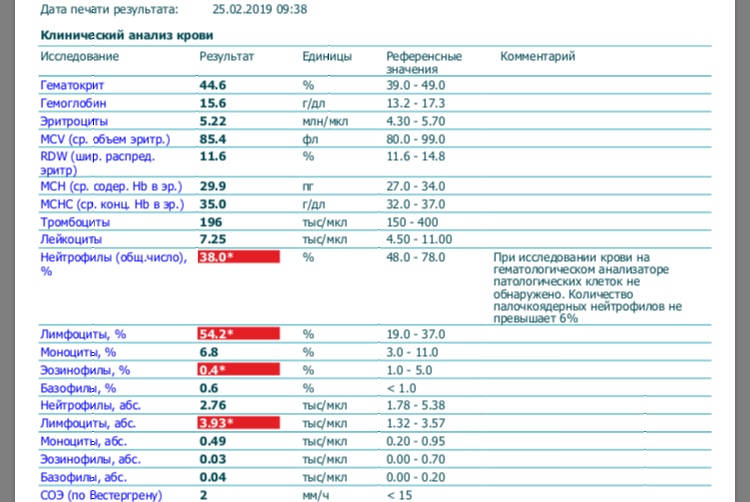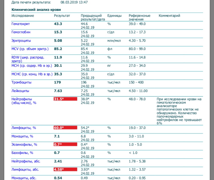 Где то на форуме тут уже обсуждали что лифоциты повышаются при вирусных инфекциях.aleksey152 писал(а): ↑08 мар 2019 14:43 Может кто подскажет,или есть у кого спросить?Лимфоциты и нейтрофилы высоко очень!Это я сдавал сам для себя,без направления врача!Разница вроде недели две ,между анализами.