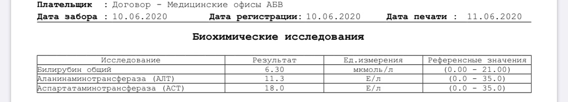 АЛТ 11, АСТ 18, билирубин 6,3