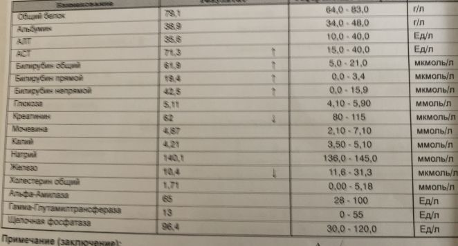 0 д: ВН - 669 805 МЕ/мл; АЛаТ - 86,2; АСаТ - 41,48; ГГТ - 206